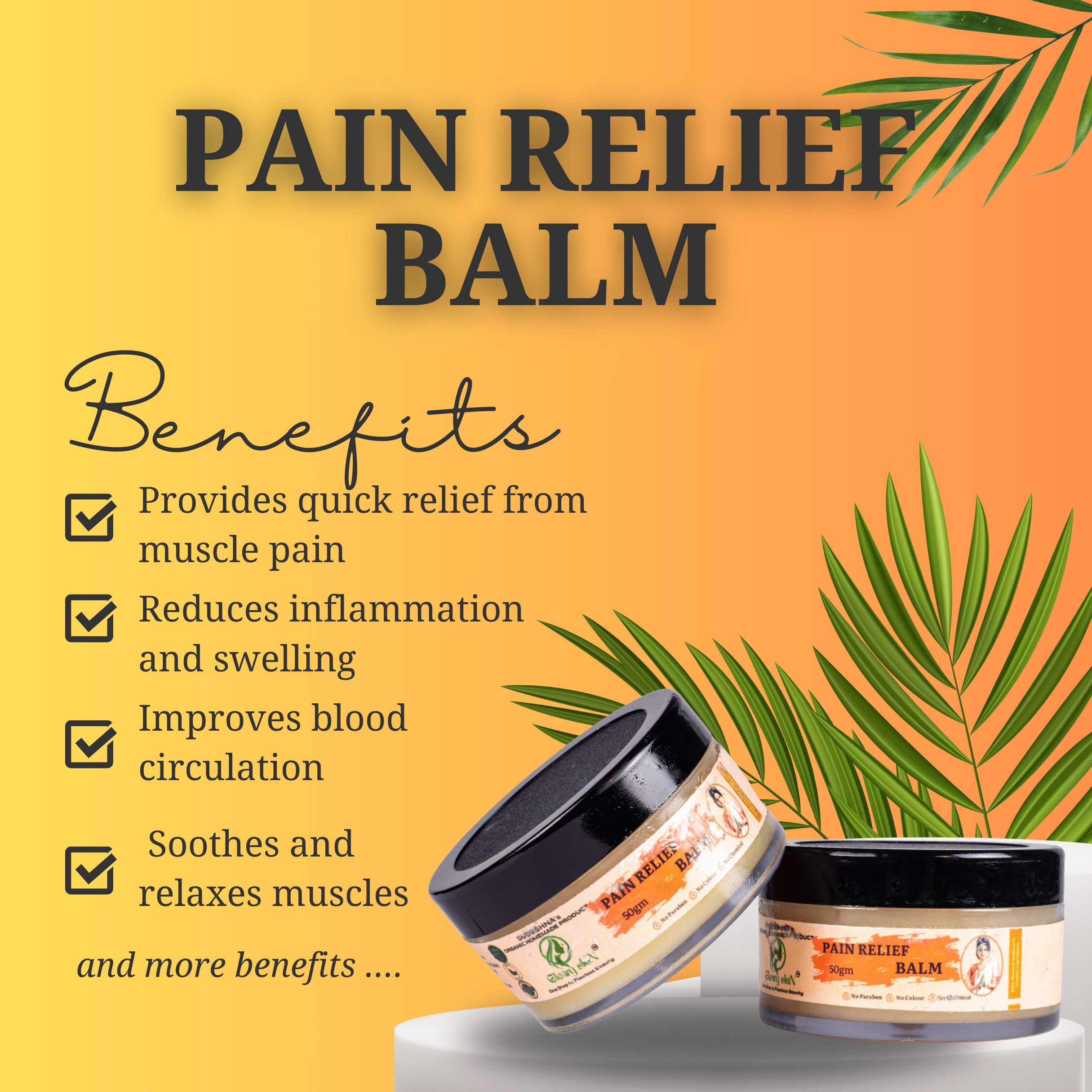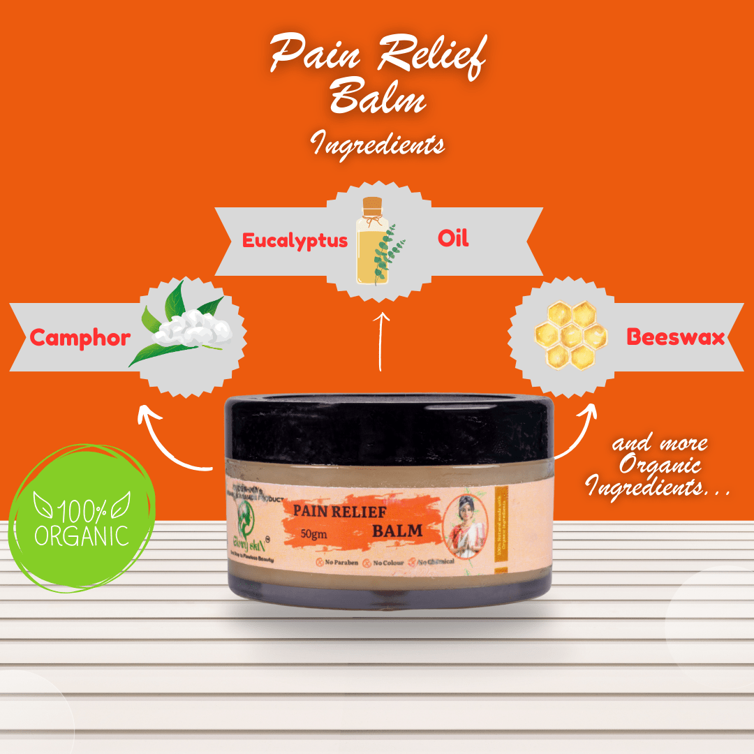 A natural pain relief balm infused with eucalyptus oil, camphor, and menthol to relieve muscle tension, joint pain, and body aches. It provides a warming sensation that soothes soreness, reduces inflammation, and promotes relaxation.